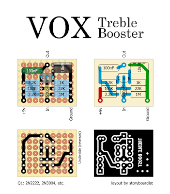 The Vox Treble Booster was a simple silicon treble boost effect that plugged straight into an amp’s input jack. It allowed the user a boost in high frequencies for lead work. I laid this one out to use as a built in effect on a guitar (hence the lack of a power filtering cap and polarity protection). Note that the 10uF cap is on its side to reduce the height of the populated board. It should easily fit in a 1590A. If you want a volume control use a 100k pot with the Out pad going to lug 3. Lug 2 becomes the Out and lug 1 goes to ground. I found that I really didn’t need a volume pot though, as the effect level was right around unity.